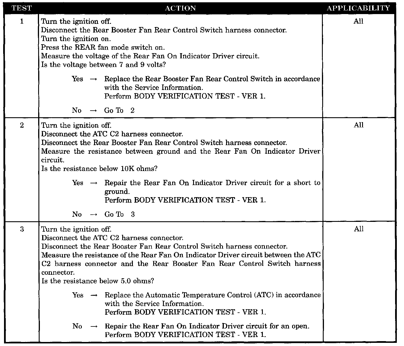 REAR BOOSTER FAN REAR CONTROL SWITCH ON INDICATOR INOPERATIVE