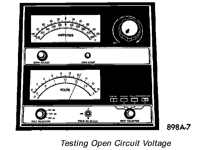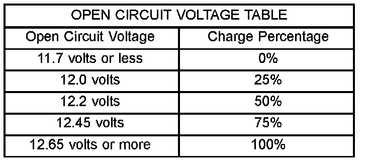 A battery open-circuit voltage test will show the approximate state-of-charge of a battery. This test can be used if no other battery tester is available.Before proceeding with this test, completely charge the battery. Refer to Standard Procedures for the proper battery charging procedures.