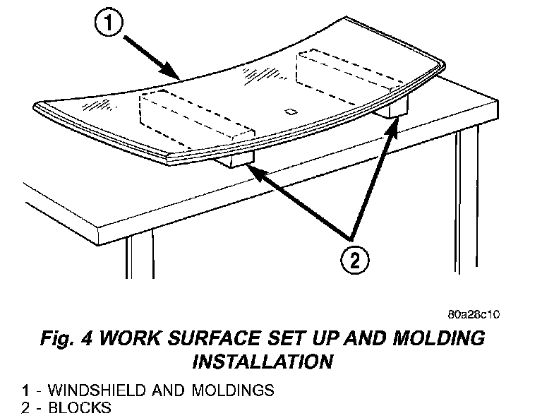 5. Position the liftgate glass inside up on a suitable work surface with two padded, wood 10 cm by 10 cm by 50 cm (4 in. by 4 in. by 20 in.) blocks, placed parallel 75 cm (2.5 ft.) apart (Fig. 4).