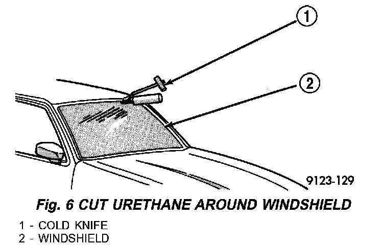 7. Using a sharp cold knife, cut urethane adhesive holding the windshield to the A-pillars, roof header and cowl pinch weld fences (Fig. 6). A power cutting device can be used if available.