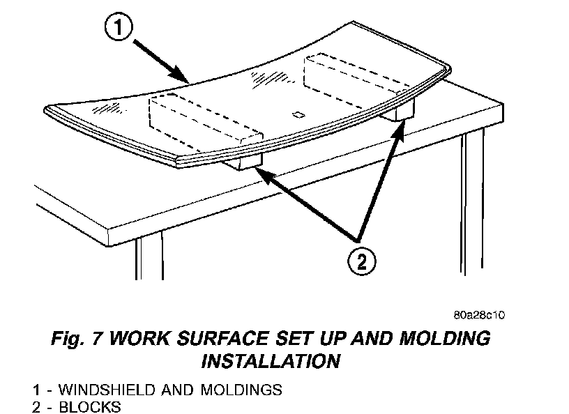 4. Position the windshield inside up on a suitable work surface with two padded, wood 10 cm by 10 cm by 50 cm (4 in. by 4 in. by 20 in.) blocks, placed parallel 75 cm (2.5 ft.) apart (Fig. 7).