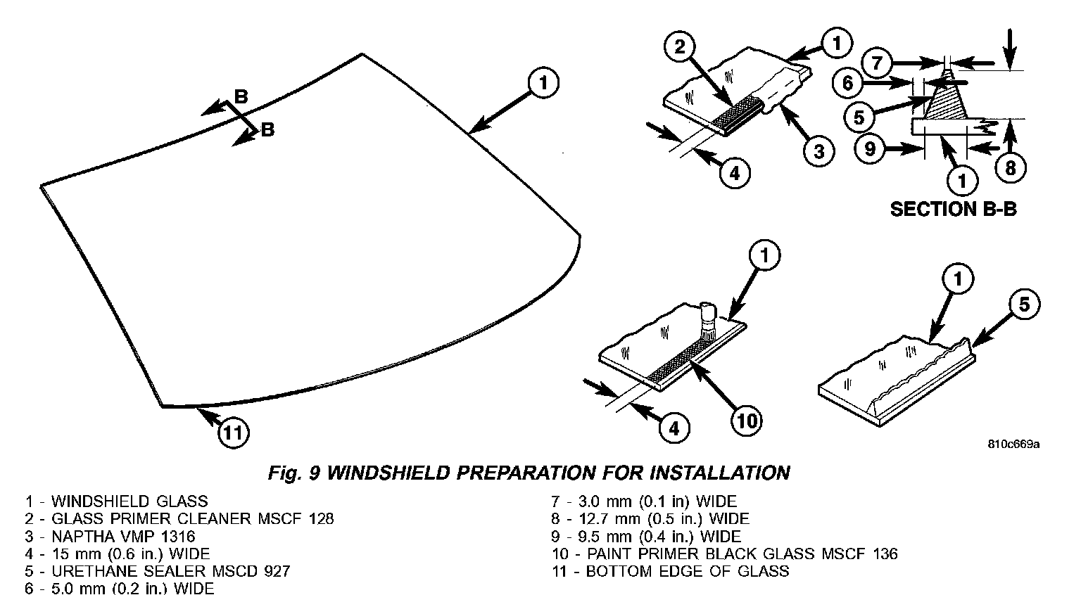 8. Apply Glass Primer 15 mm (0.6 in.) wide around perimeter of windshield. Allow at least three minutes drying time (Fig. 9).