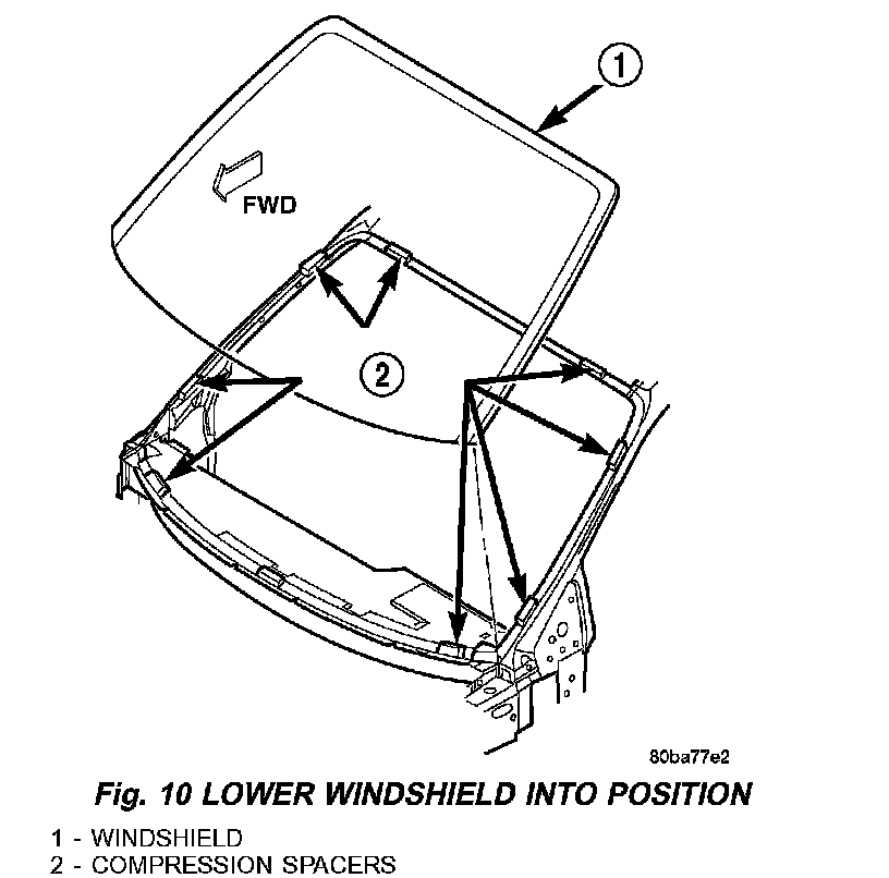 11. If a low viscosity urethane adhesive is used, install compression spacers on the fence around the windshield opening (Fig. 10).