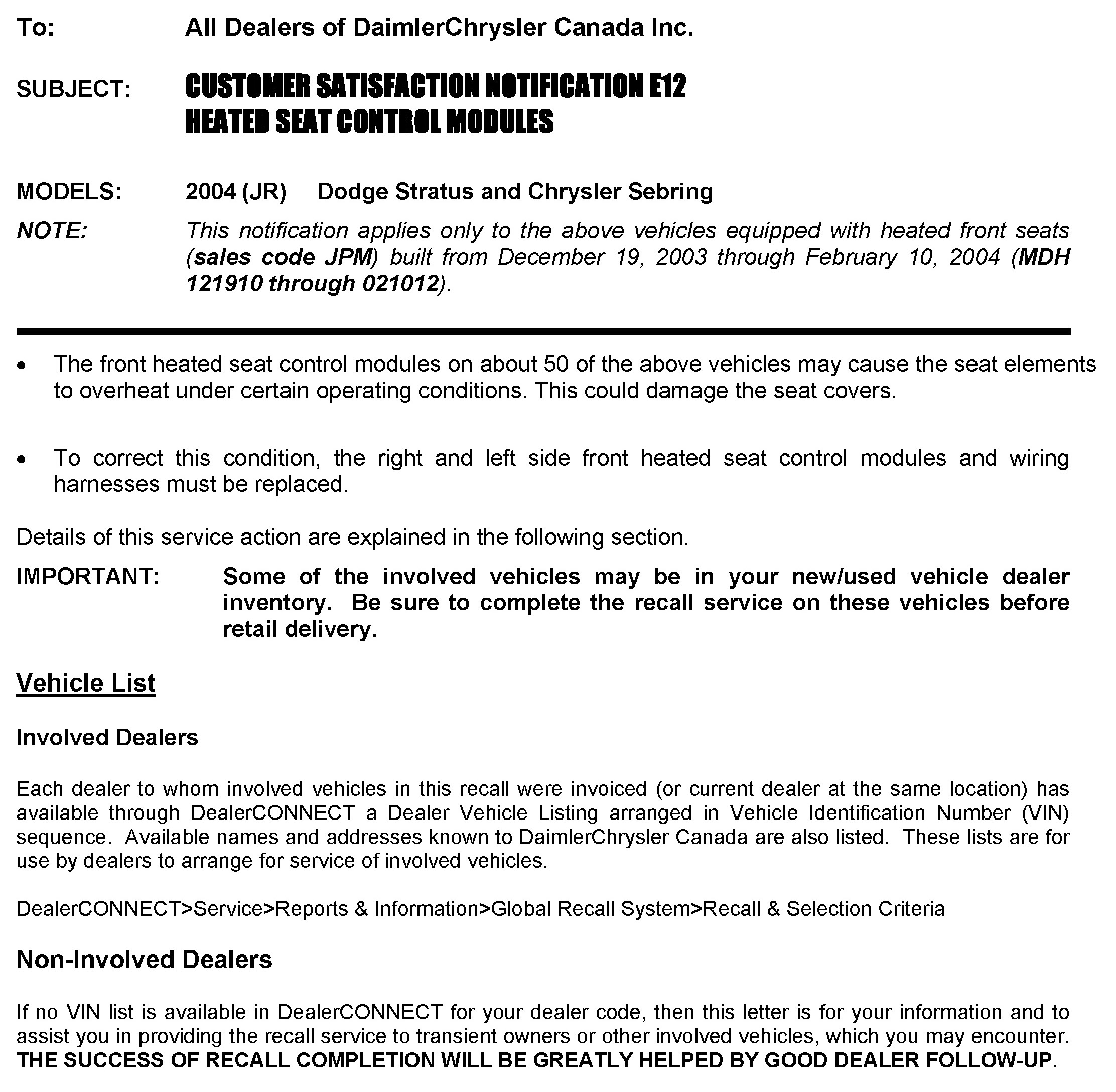 Customer Satisfaction Notification E12 - Heated Seat Control Modules