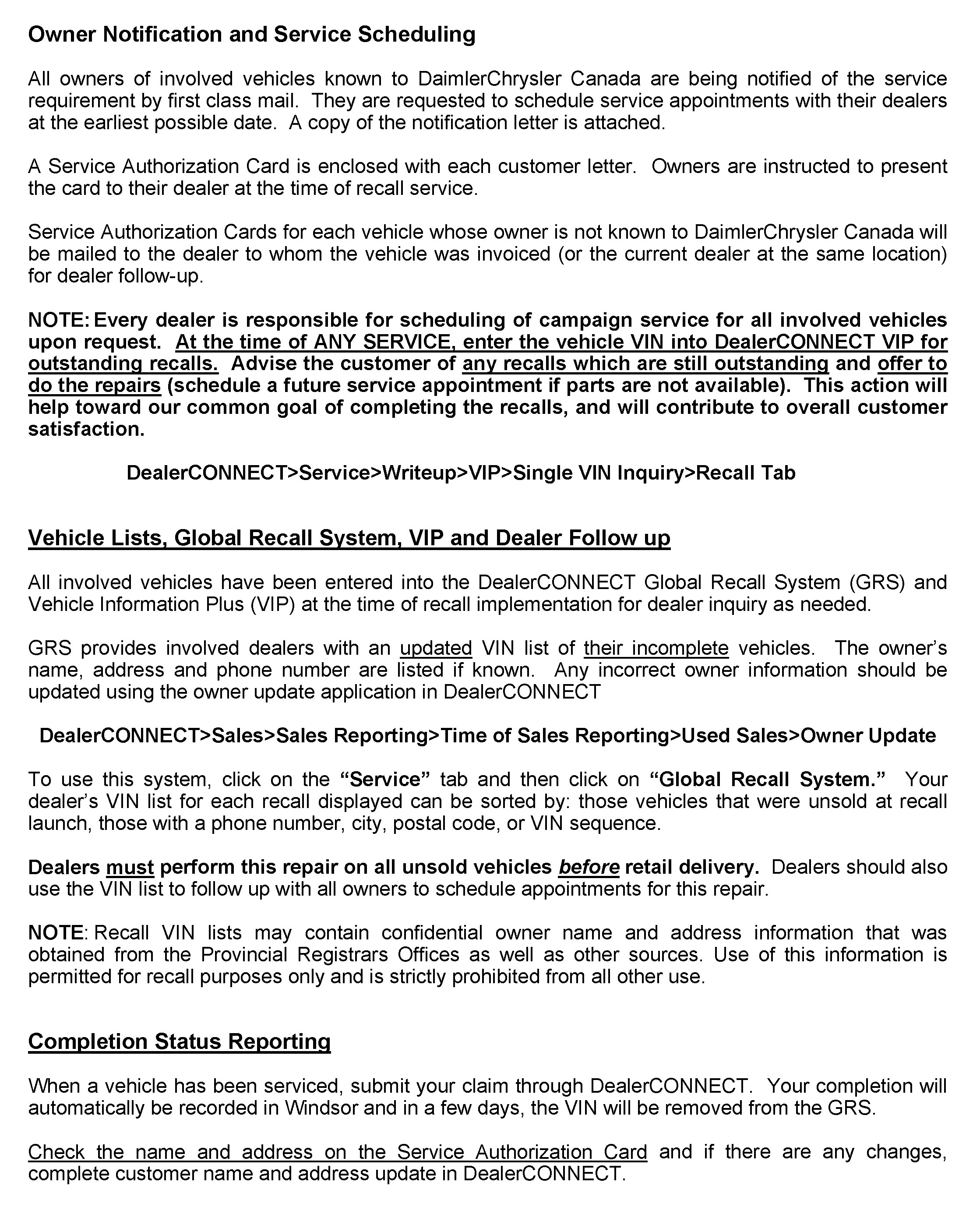 Global Recall System (GRS) has been developed to provide dealers with an up-to-date list of involved vehicles by recall number and by dealer code. Owners known to DaimlerChrysler are also listed. Involved vehicles will be removed from GRS within several days of submitting repair claims.
