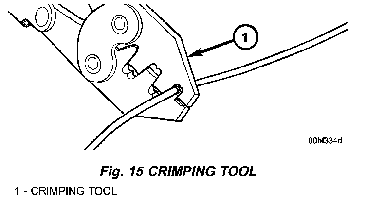 4. Using crimping tool, Mopar p/n 05019912AA, crimp the splice clip and wires together (Fig. 15).