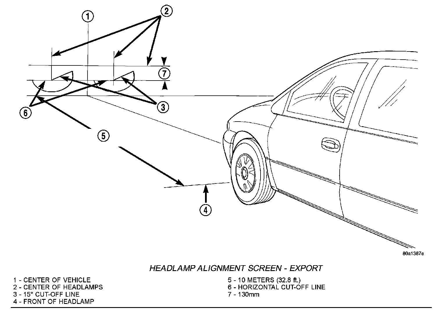 A properly aimed low beam headlamp will project a high intensity light pattern on the screen with the horizontal cut-off line aligned with the tape line 130 mm (5.12 in.) below the headlamp centerline. The intersection of the horizontal and 15 degree cut-off lines in the projected pattern should align to the intersection of the headlamp centerline vertical tape line and the tape line 130 mm (5.12 in.) below the headlamp horizontal centerline. The high beam pattern should be correct when the low beams are aligned properly.