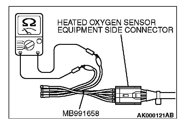 1. Disconnect the heated oxygen sensor connector and connect special tool MB991658 to the connector on the heated oxygen sensor side.
