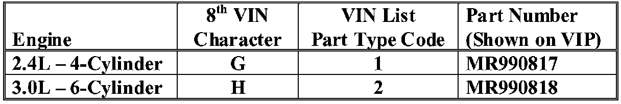 The appropriate fuel pump module for the vehicle being serviced is displayed on the DealerCONNECT VIP function and may also be determined by using the table shown.