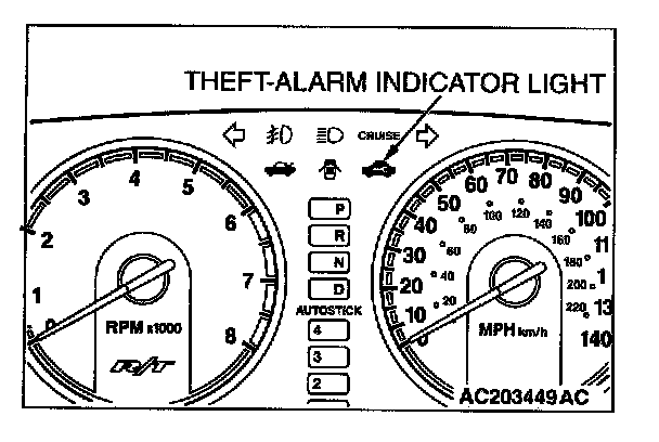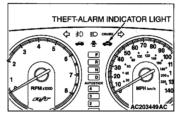 If an attempt is made to start the engine with an unregistered ignition key, cranking occurs, but fuel supply is cut off to disable the engine. In approx. 10 seconds, the theft-alarm indicator will blink for approx. 30 seconds.