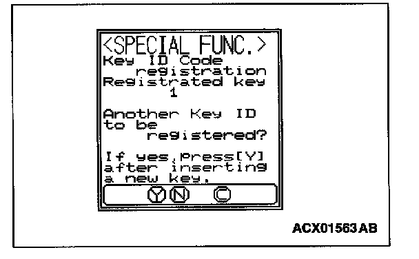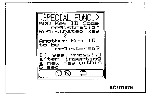 9. The number of keys currently registered will be displayed. To register an additional key, replace the ignition key with the next key to be registered within five seconds and then press the YES key. Key ID registration screen will be displayed, then register another key.