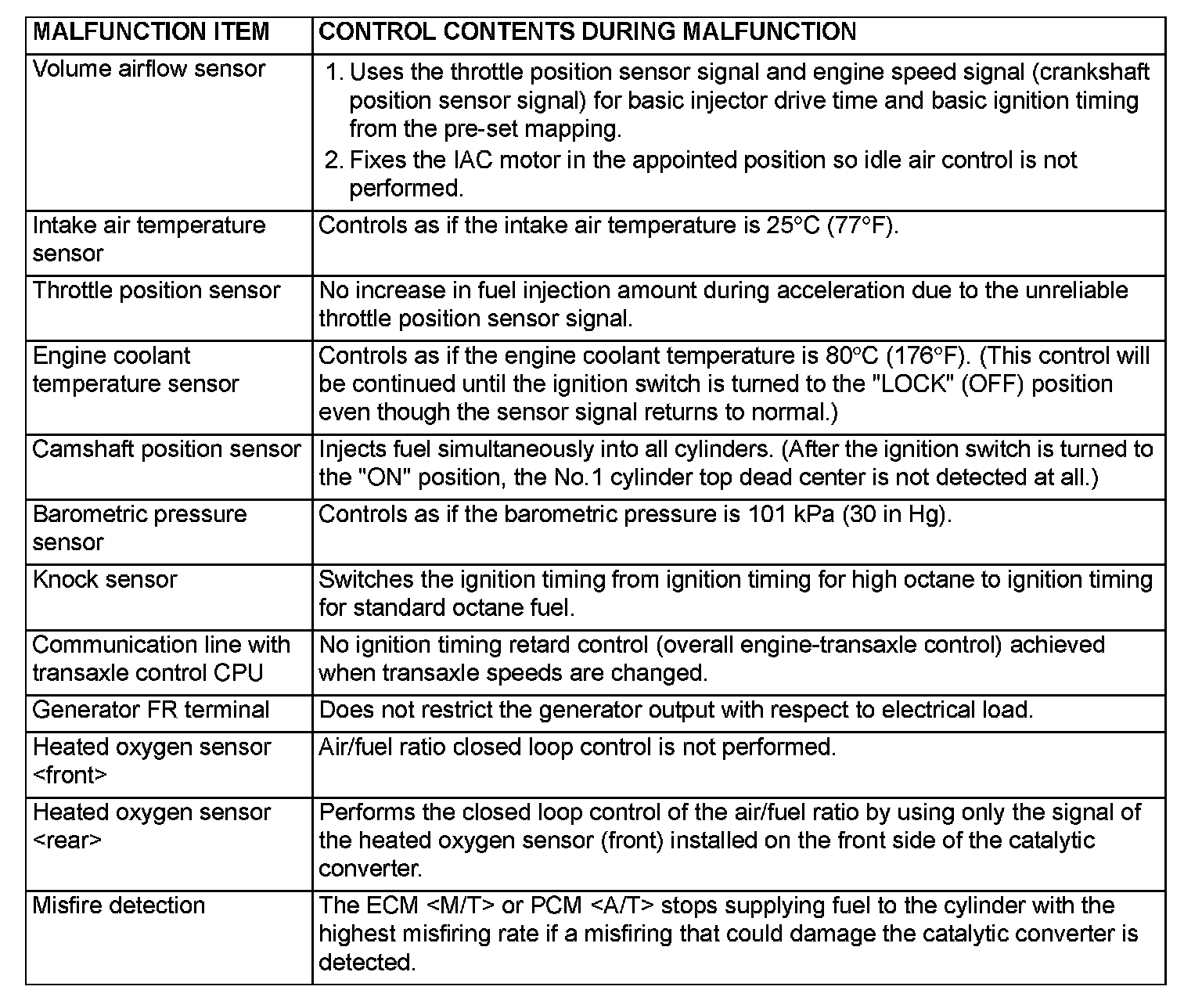 When the main sensor malfunctions are detected by the diagnostic test mode, the vehicle is controlled by means of the following defaults.