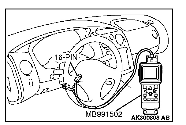 CAUTION: To prevent damage to scan tool MB991502, always turn the ignition switch to the "LOCK" (OFF) position before connecting or disconnecting scan tool MB991502.