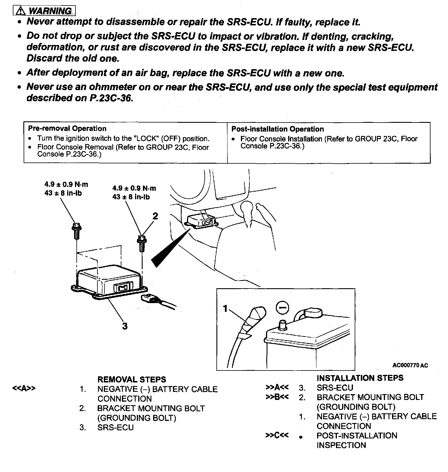- Check the SRS-ECU and brackets for dents, cracks or deformation.