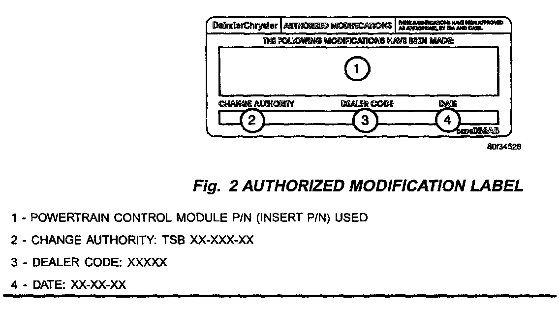 5. Type the necessary information on the "Authorized Modification Label" p/n 04275086AB and attach near the VECI label (Fig. 2).