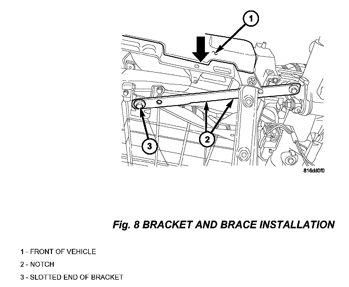 The slotted end of the brace attaches to the brace bracket with the notched out portion of the brace facing toward the front of the vehicle, (Fig. 8).