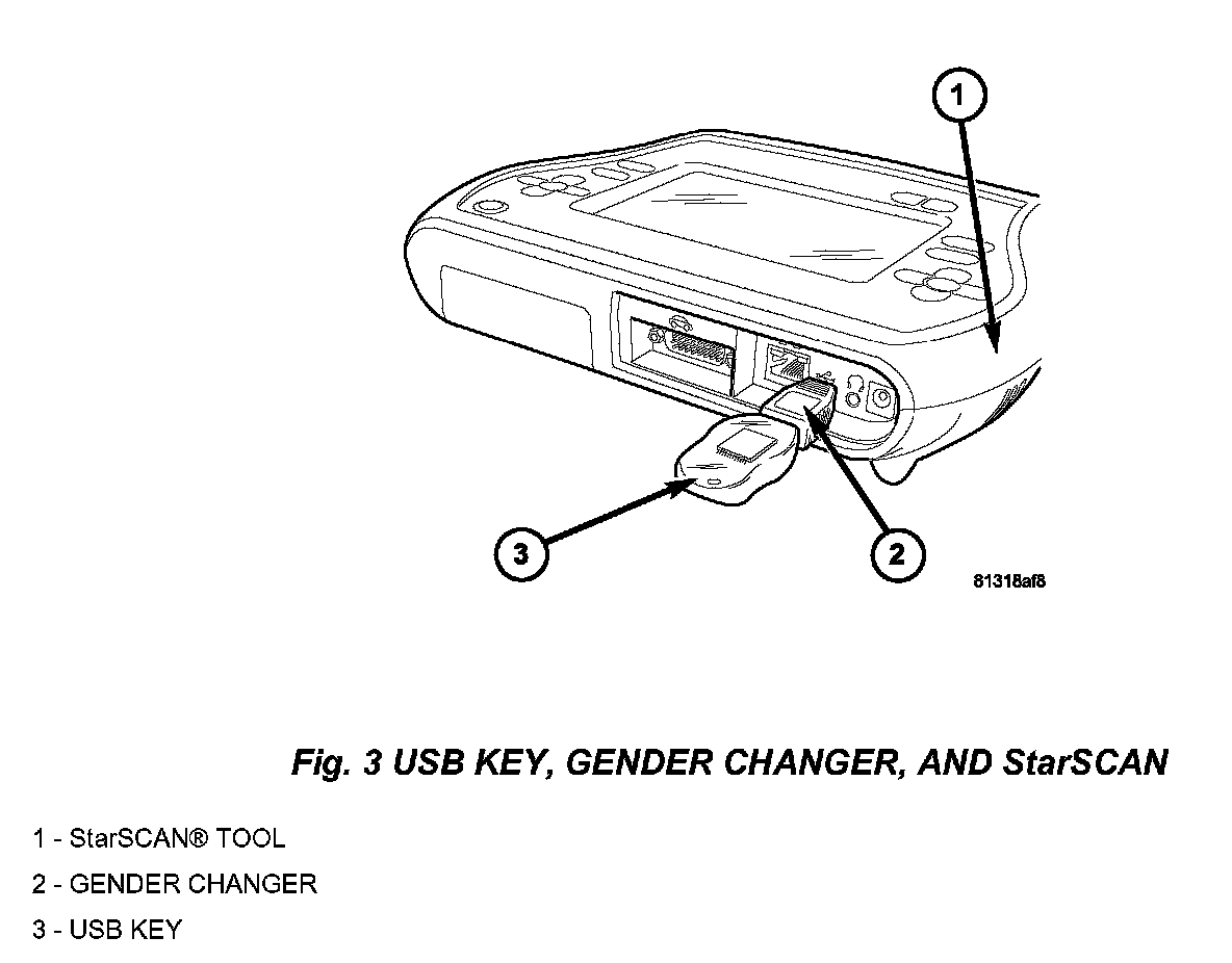 8. With the StarSCAN powered OFF, connect the USB Key and Gender Changer to the StarSCAN USB port (Fig. 3).