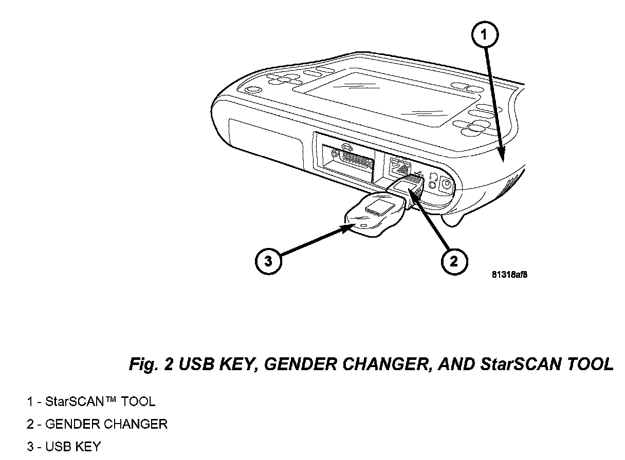 8. With the StarSCAN powered OFF, connect the USB Key and Gender Changer to the StarSCAN USB port (Fig. 2).