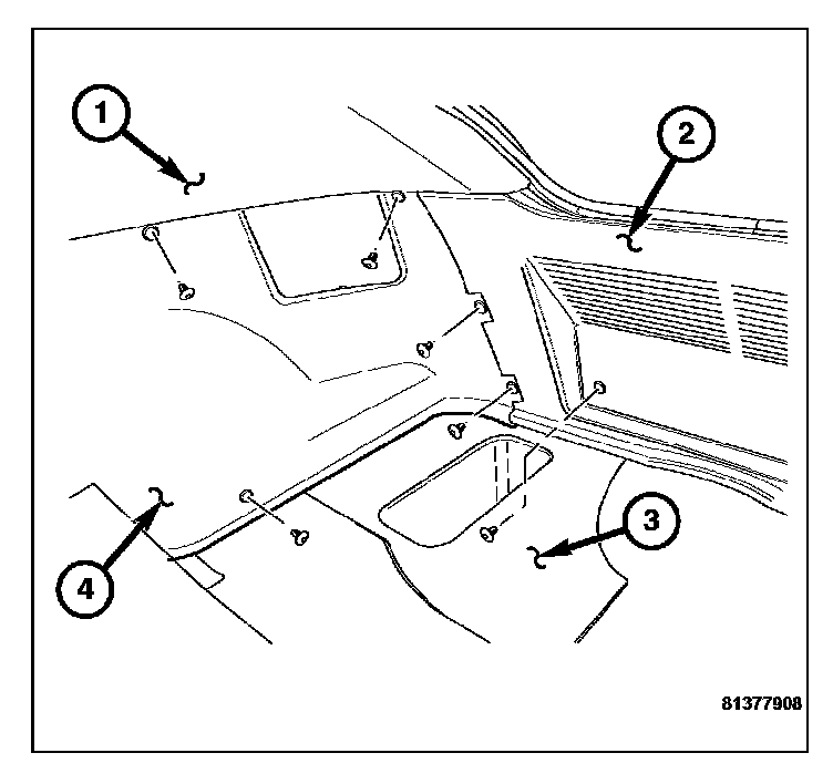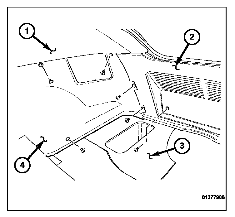 4. Remove the upper right roof trim panel (1).