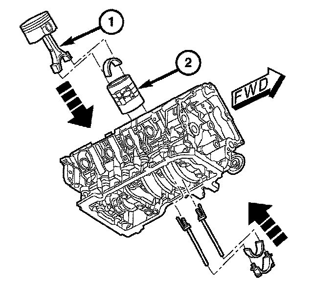 5. Load the piston/connecting rod assembly (1) into a ring compressor (2) with light oil lubrication.