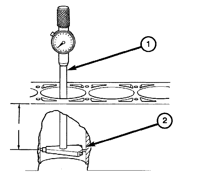 The piston and cylinder walls must be clean and dry. Piston diameter should be measured 90 degrees to piston pin axis. Cylinder bores should be measured halfway down the cylinder bore (2) and transverse to the engine crankshaft center line.
