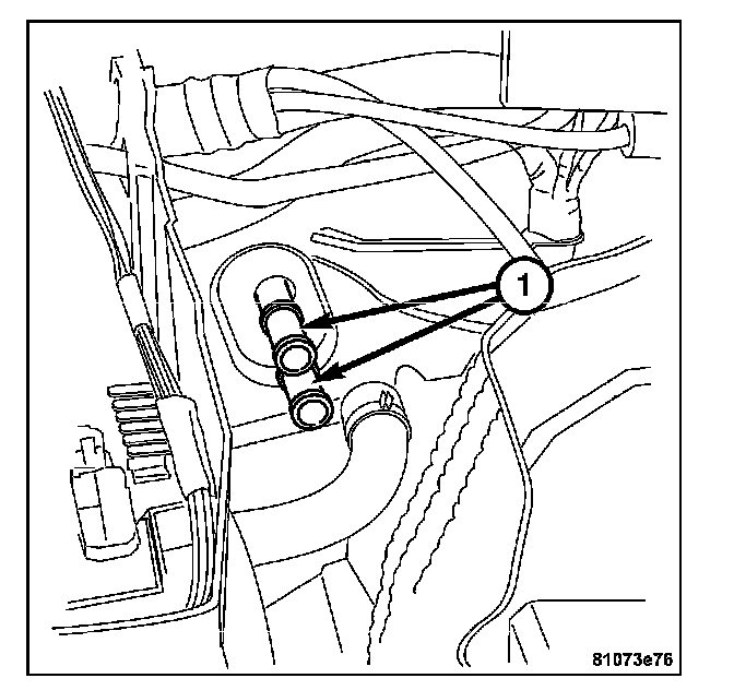25. Install the hot water hose (1) the install the hot water hose clamp located inboard to the brake booster on the bulkhead.