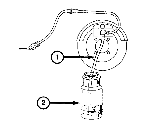 3. Attach one end of the bleed hose (1) to the bleed screw and insert the opposite end in a glass container (2) partially filled with brake fluid. Be sure the end of the bleed hose is immersed in the brake fluid.