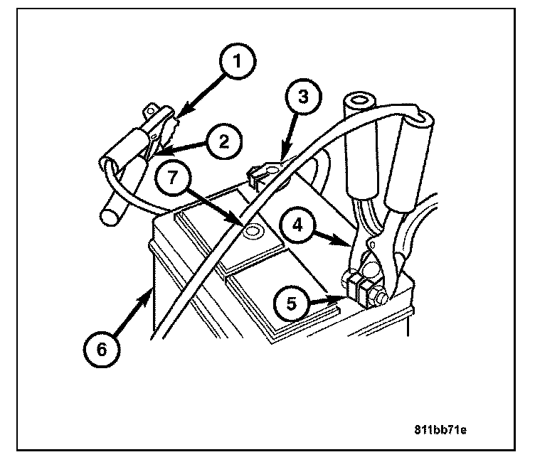 5. Connect other end of positive jumper cable (7) to positive terminal (+) booster battery.