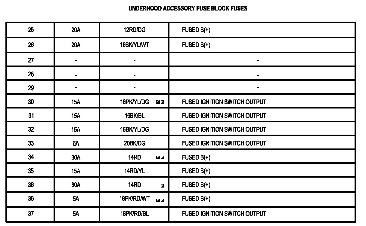 Fuse Information Table (Fuse 25 - Fuse 37):