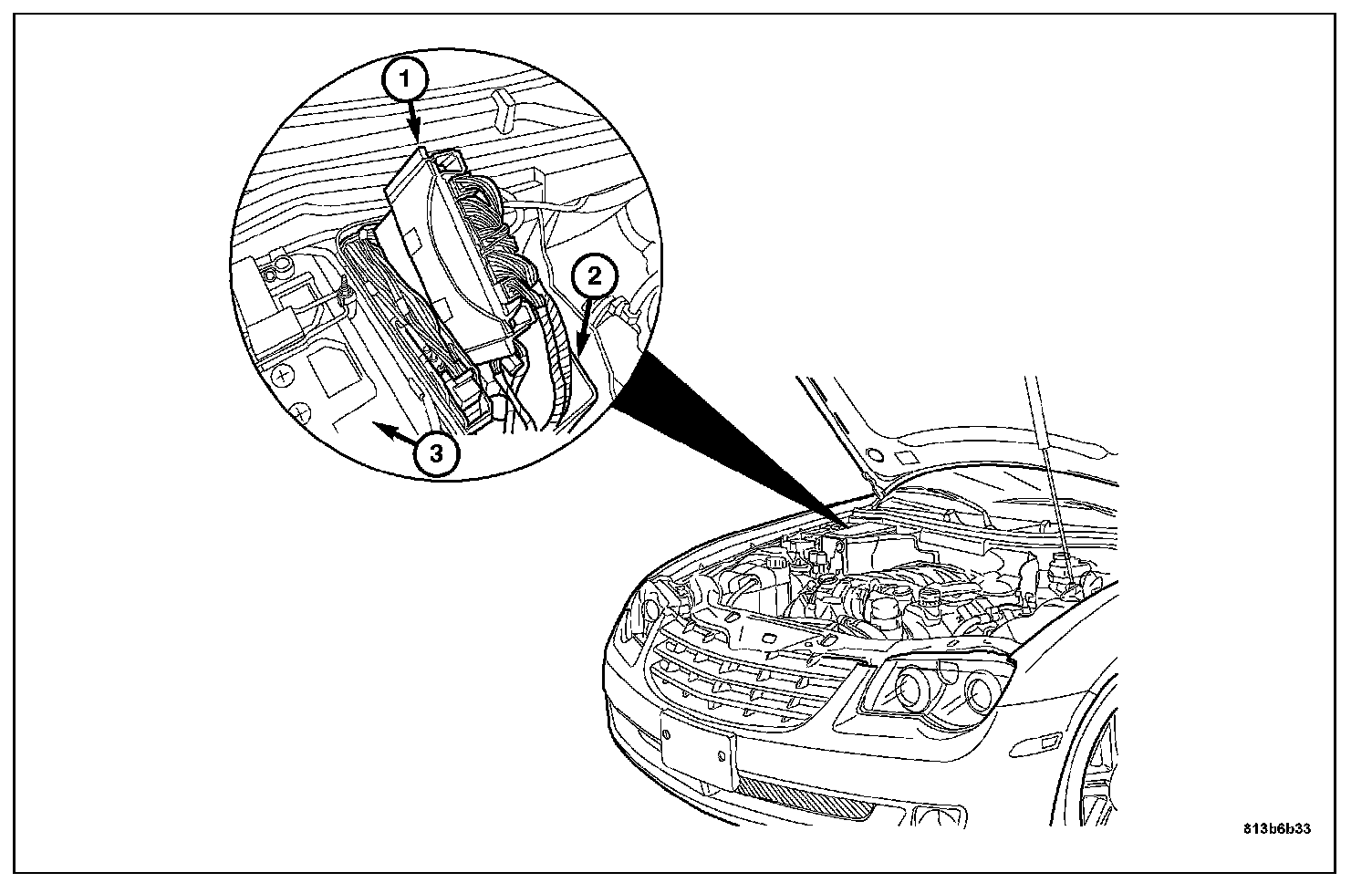 The Powertrain Control Module (1) is concealed in the engine compartment inside the Control Module Box (2) located next to the Battery (3).