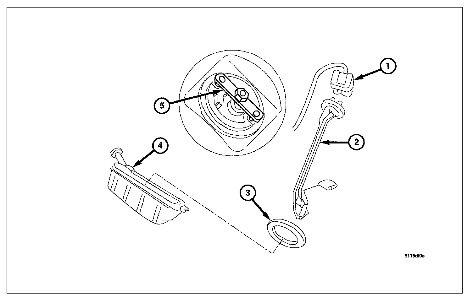 The Fuel Level Sending Unit (2) is combined with a Fuel Tank Pressure Sensor and is mounted at the top of the Fuel Tank (4) extending downward inside. The sending unit is a lever-type sensor with sliding contacts (potentiometer).