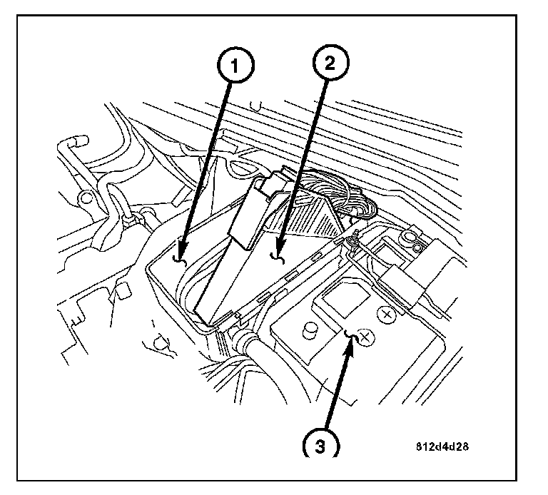 The Body Control Module (BCM) (2) is concealed in the engine compartment inside of the Control Module Box (1) located next to the battery (3).