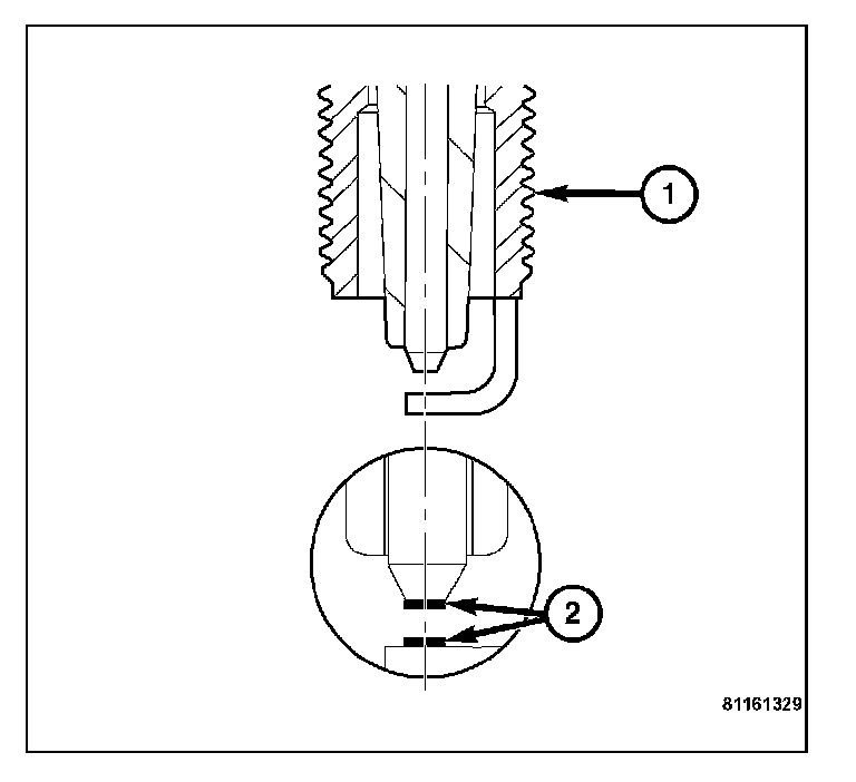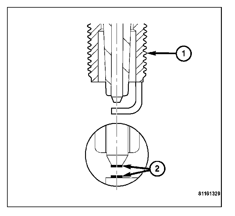 Spark plugs using either a single or double platinum tips have a recommended service life of 100,000 miles for normal driving conditions per schedule A. The spark plugs have a recommended service life of 75,000 miles for severe driving conditions. A thin platinum pad is welded to the center electrode (2) ends. Extreme care must be used to prevent spark plug cross threading, incorrect gapping, and ceramic insulator damage during plug removal and installation. Remove the spark plugs and examine them for burned electrodes and fouled, cracked or broken porcelain insulators. Keep the spark plugs arranged in the order in which they were removed from the engine. An isolated spark plug displaying an abnormal condition indicates that a problem exists in the corresponding cylinder.
