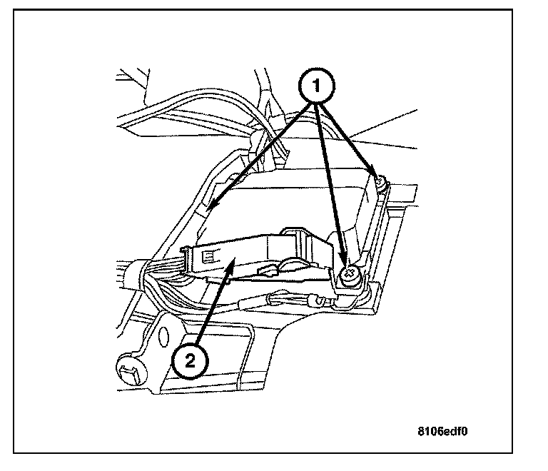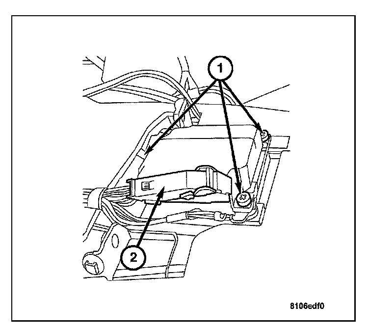 2. Install and tighten the screws (1) that secure the occupant restraint controller to the mount. Observe the ground lead mounting location on the left rear screw. Tighten the screws to 11 N.m (97 in. lbs.).