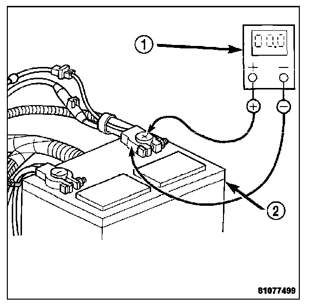 1. Connect the positive lead of the voltmeter (1) to the battery. (2)negative terminal post. Connect the negative lead of the voltmeter (1) to the battery (2) negative cable clamp. Rotate and hold the ignition switch in the Start position. Observe the voltmeter. If voltage is detected, correct the poor contact between the cable clamp and the terminal post.
