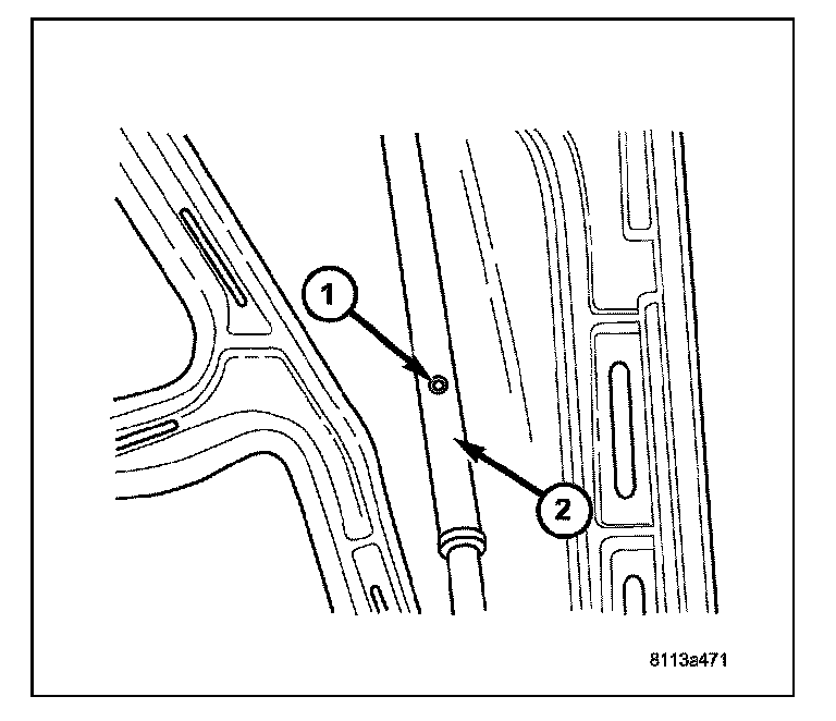 4. Align the center of the wiper blade (2) with the top of the dot matrix (1) on the bottom of the windshield. Torque the wiper arm retaining nut to 19 N.m (14 ft. lbs.).