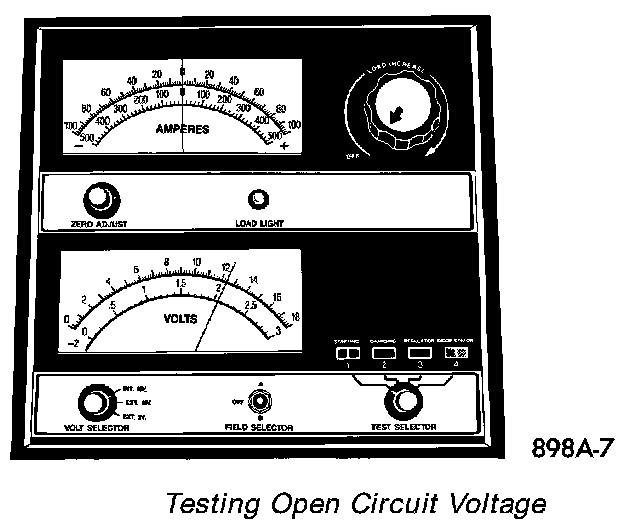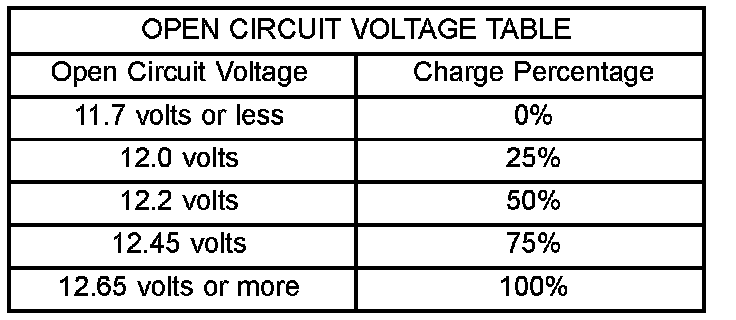 A battery open-circuit voltage test will show the approximate state-of-charge of a battery. This test can be used if no other battery tester is available.Before proceeding with this test, completely charge the battery. Refer to Standard Procedures for the proper battery charging procedures.