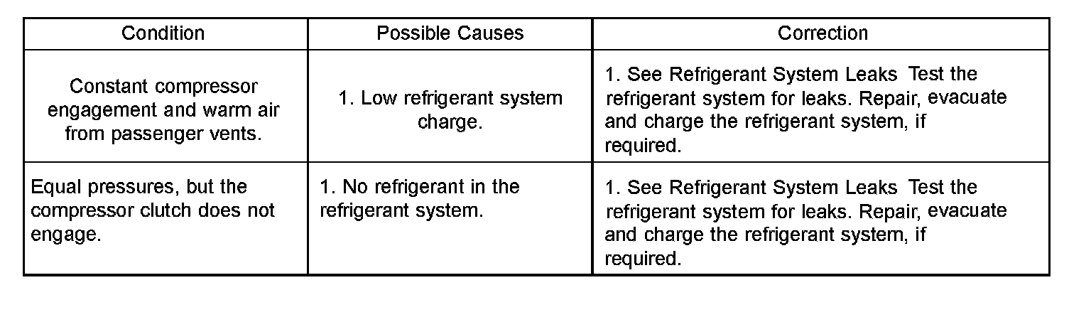 7. With the compressor clutch engaged, record the left center panel air outlet discharge temperature, the discharge pressure (high side service port) and the suction pressure (low side service port). The compressor clutch may cycle, depending upon the ambient temperature and humidity. If the clutch cycles, use the readings obtained before the clutch disen gaged.