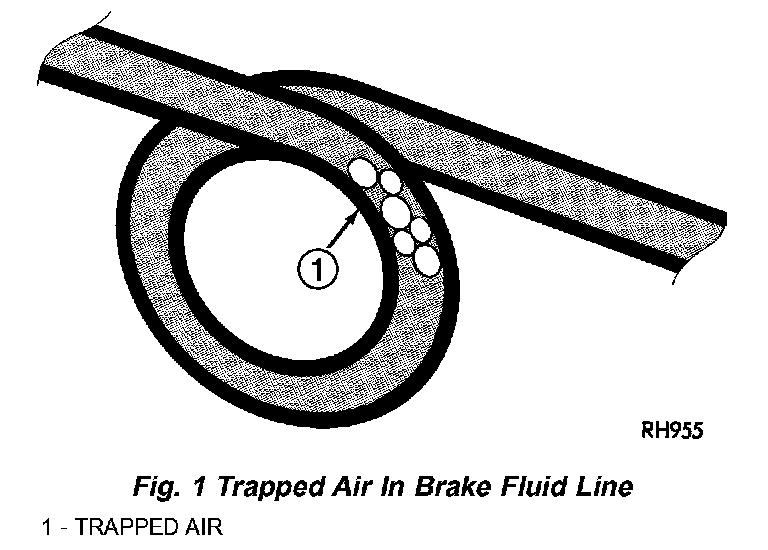 NOTE: When bleeding the brake system, some air may be trapped in the brake lines or valves far upstream, as much as ten feet from the bleeder screw (Fig. 1). Therefore, it is essential to have a fast flow of a large volume of brake fluid when bleeding the brakes to ensure all the air gets out.