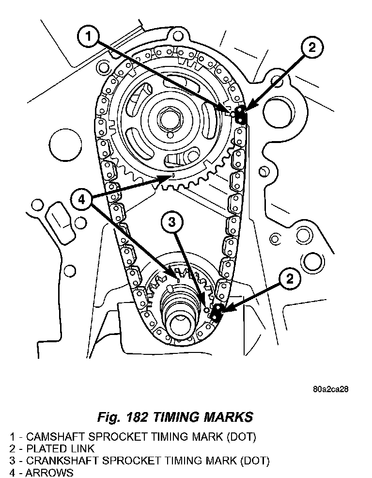 and check timing mark alignment (Fig. 182). If timing marks do not line up, remove camshaft sprocket and realign.