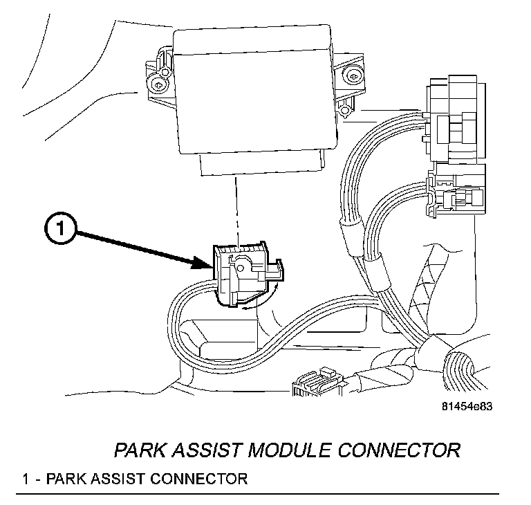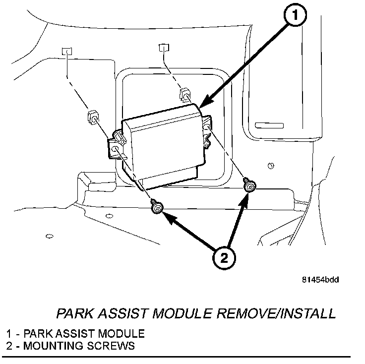 1. Position the Park Assist Module and install the two attaching screws. Torque screws to 3.5 N.m (30 in. lbs.).