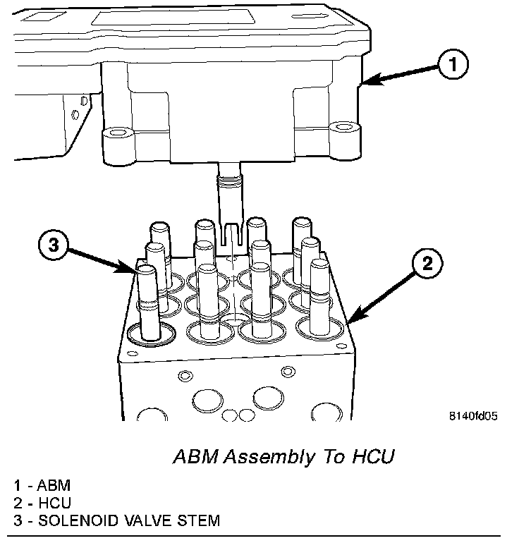 5. Align ABM solenoids and pump/motor wiring connector with HCU valves and connector passage. Slide ABM onto HCU.
