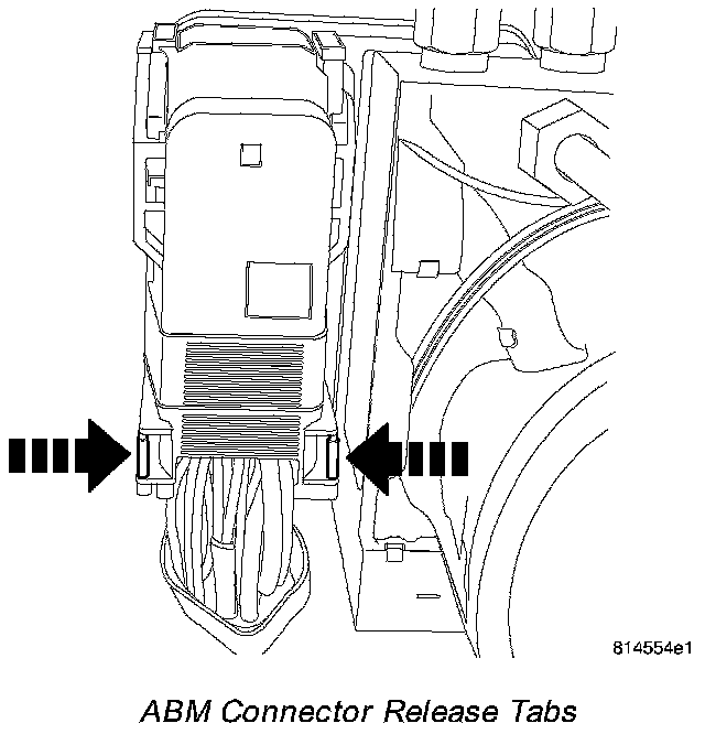 6. Disconnect the 47-way connector from the ABM by depressing the tabs on each side of the connector cover, then pulling outward and upward on the lower half of the cover until it locks into position pointing straight outward. The connector can then be pulled straight outward off the ABM.