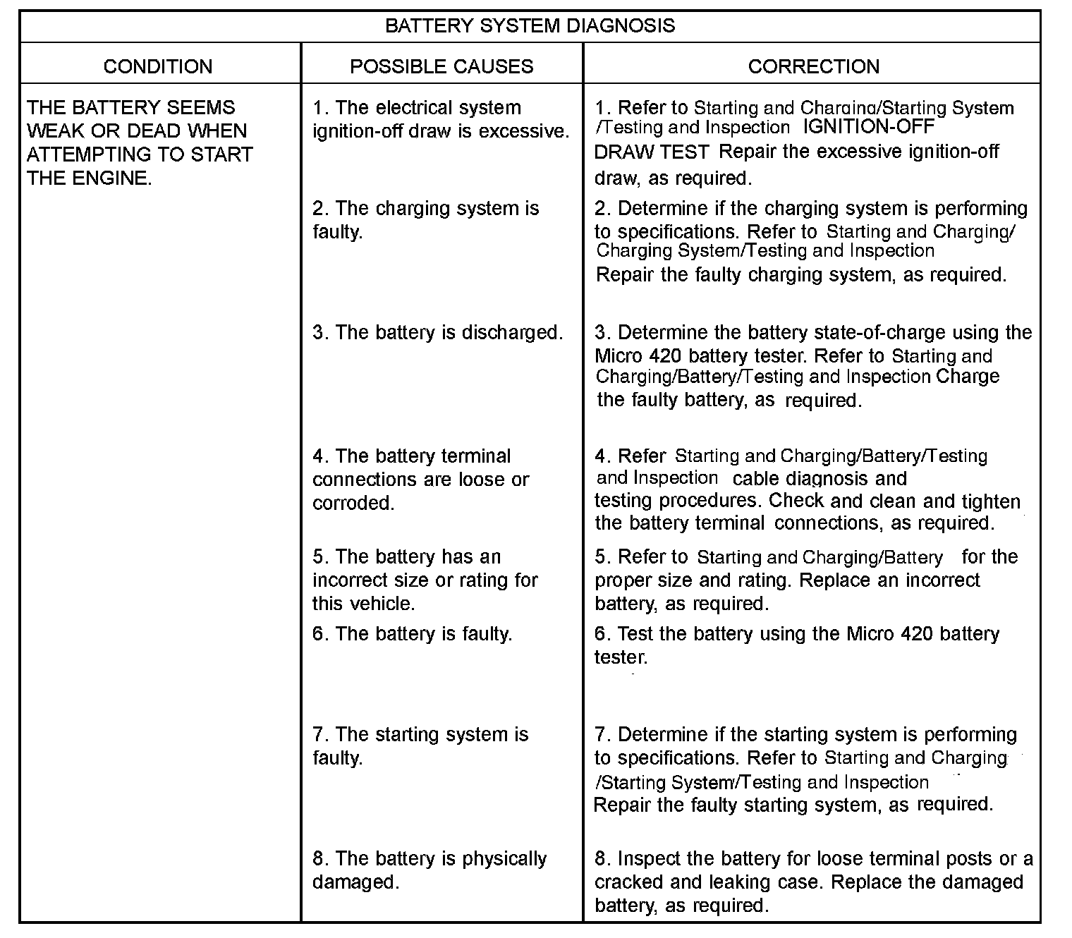 2. A faulty or incorrect battery. Use Micro 420 tester and refer to Standard Procedures for additional battery diagnosis and testing procedures.