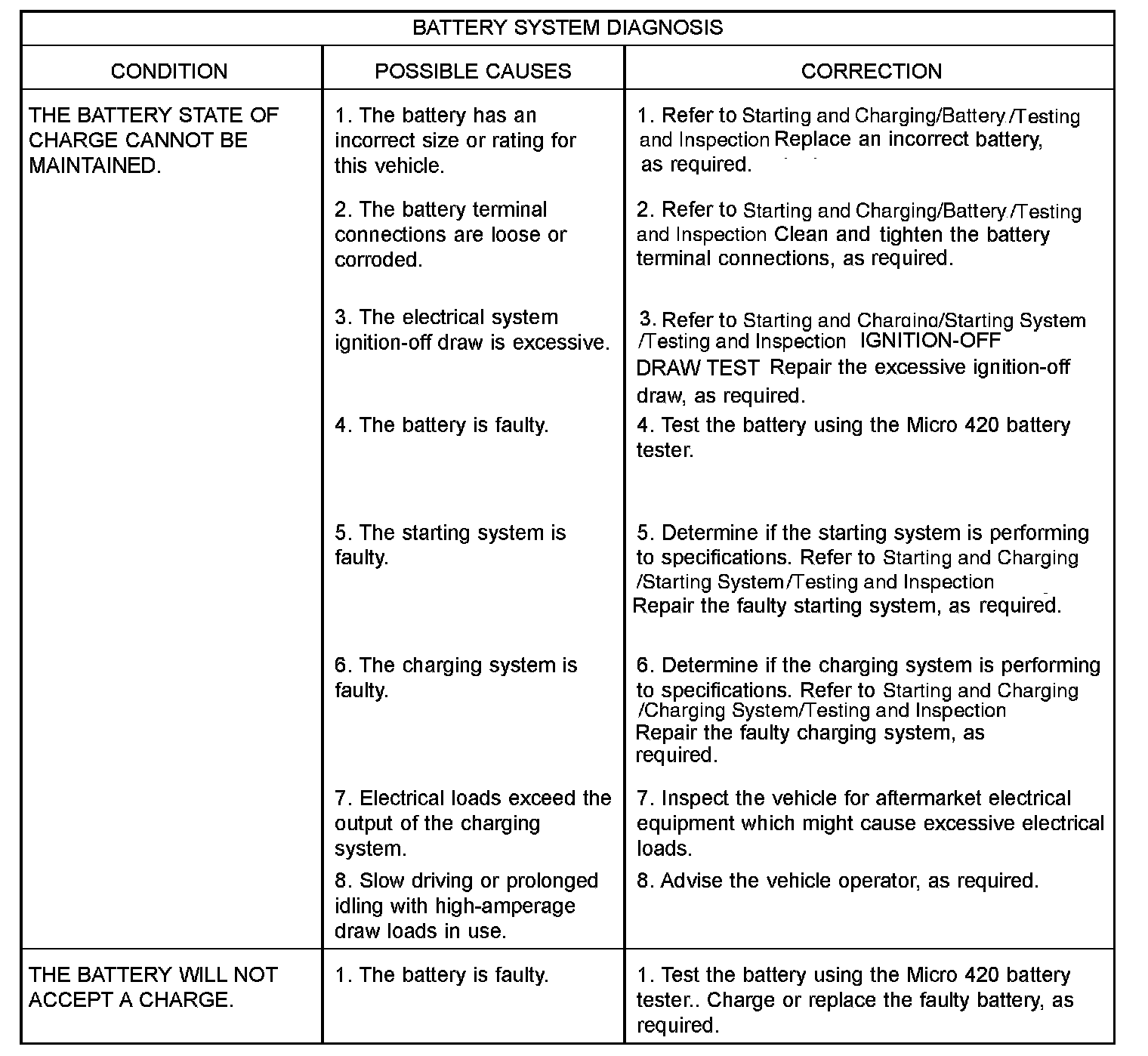 The battery, starting, and charging systems in the vehicle operate with one another and must be tested as a complete system. In order for the engine to start and the battery to maintain its charge properly, all of the components that are used in these systems must perform within specifications. It is important that the battery, starting, and charging systems be thoroughly tested and inspected any time a battery needs to be charged or replaced. The cause of abnormal battery discharge, overcharging or early battery failure must be diagnosed and corrected before a battery is replaced and before a vehicle is returned. The service information for these systems has been separated to make it easier to locate the specific information you are seeking. However, when attempting to diagnose any of these systems, it is important that you keep their interdependency in mind.The diagnostic procedures used for the battery, starting, and charging systems include the most basic conventional diagnostic methods, to the more sophisticated On-Board Diagnostics (OBD) built into the Powertrain Control Module (PCM). Use of an induction-type milliampere ammeter, a volt/ohmmeter, a battery charger, a carbon pile rheostat (load tester) and a 12-volt test lamp may be required. All OBD-sensed systems are monitored by the PCM. Each monitored circuit is assigned a Diagnostic Trouble Code (DTC). The PCM will store a DTC in electronic memory for any failure it detects. Refer to Charging System for the proper charging system on-board diagnostic test procedures.