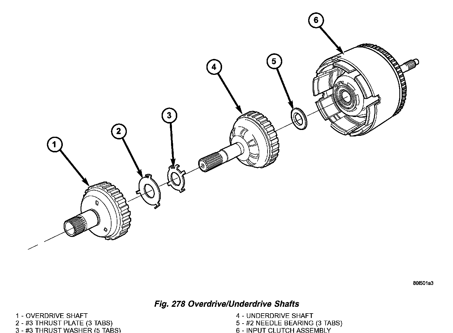 10. Remove and inspect OD and UD Shafts, as well as #3 thrust washer and plate, and #2 needle bearing (Fig. 278).