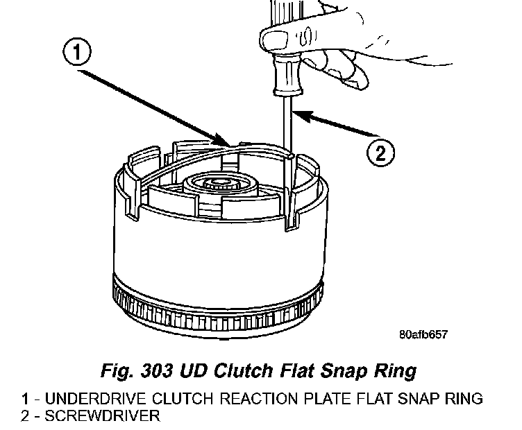 11. Install the UD clutch flat snap ring (Fig. 303).