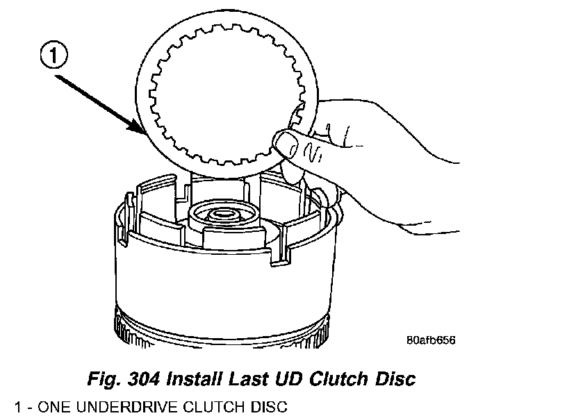 10. Install the UD clutch pack. Leave out upper disc, until snap ring is installed (Fig. 302).