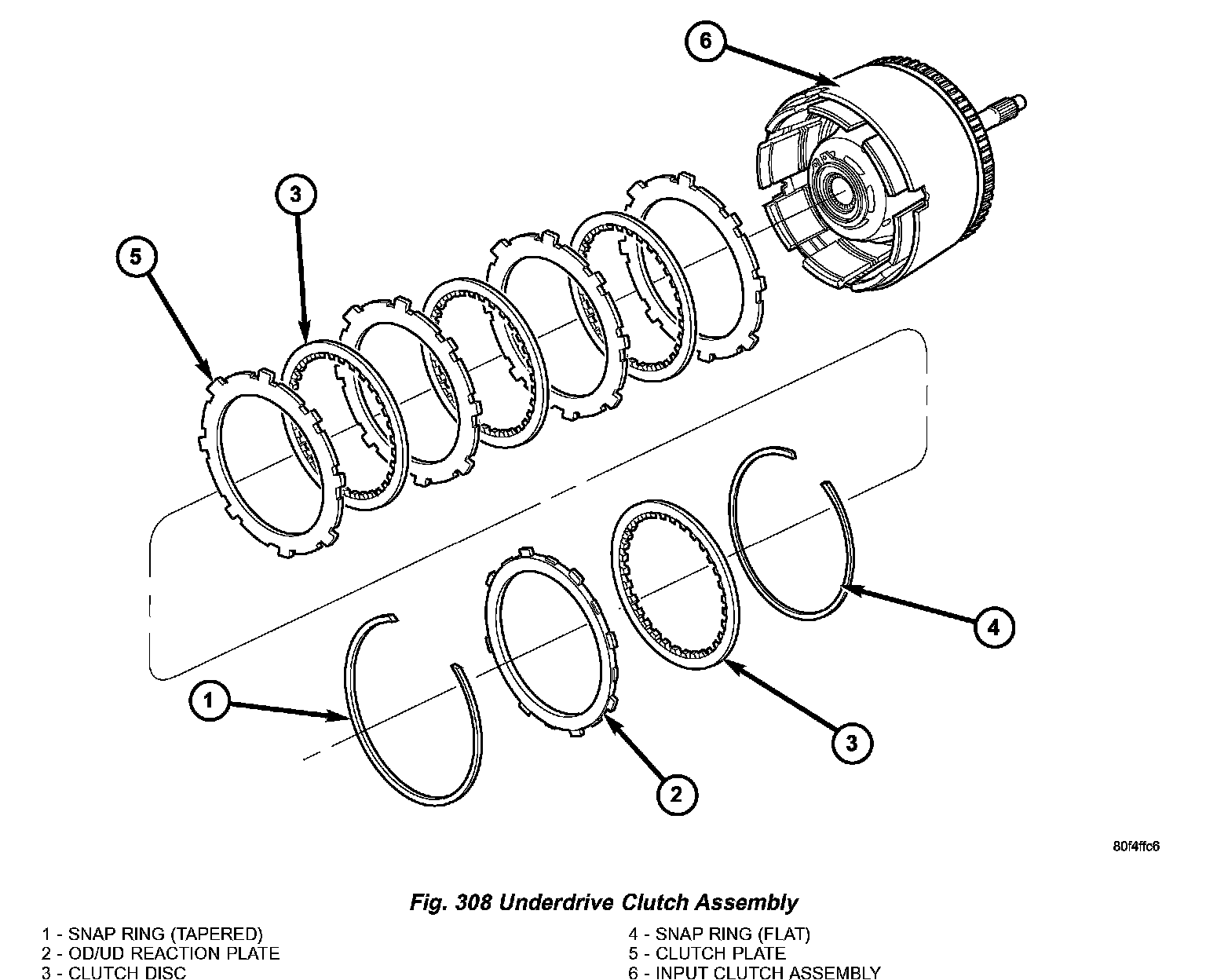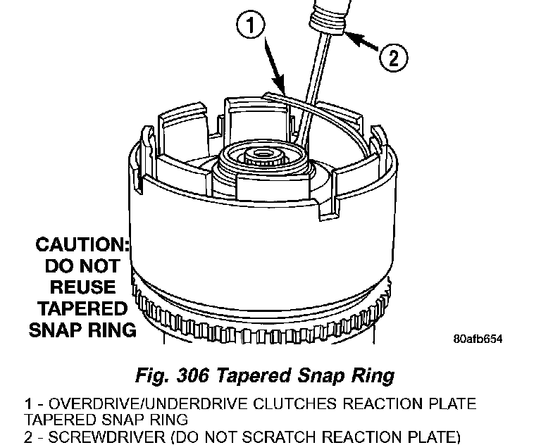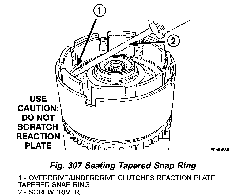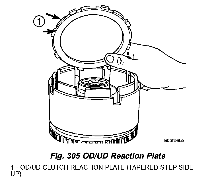 13. Install the OD/UD clutch reaction plate and snap ring (Fig. 305) (Fig. 306). The OD/UD clutches reaction plate has a step on both sides. Install the OD/UD clutches reaction plate tapered step side up.