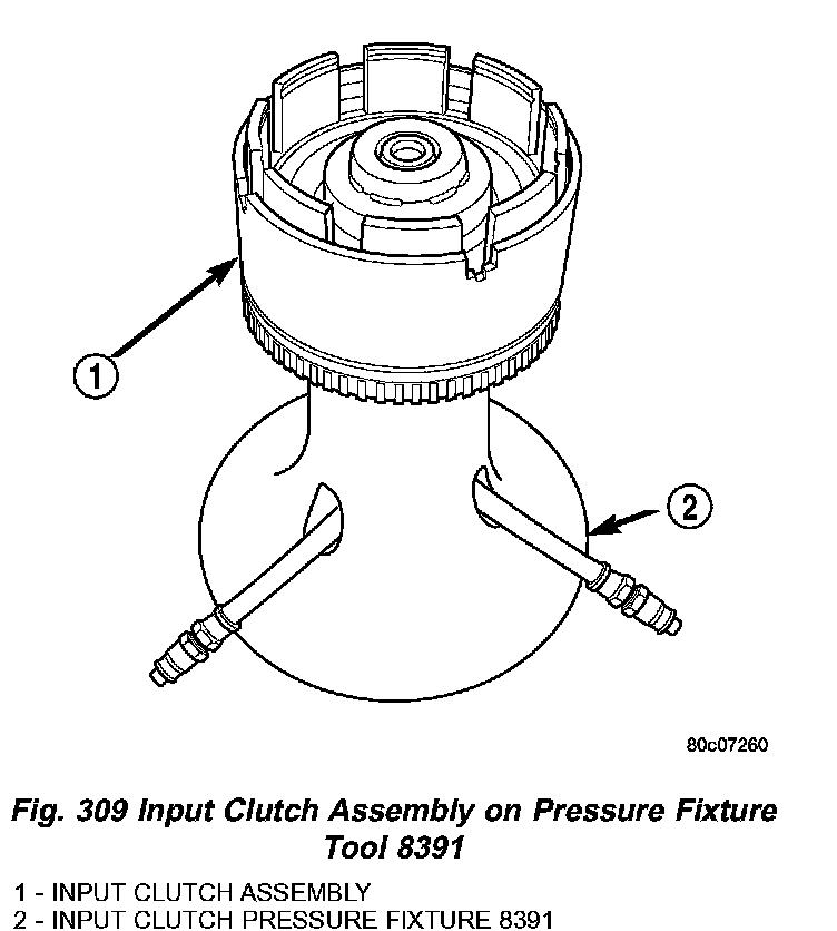 15. Install input clutch assembly to the Input Clutch Pressure Fixture-Tool 8391 (Fig. 309).
